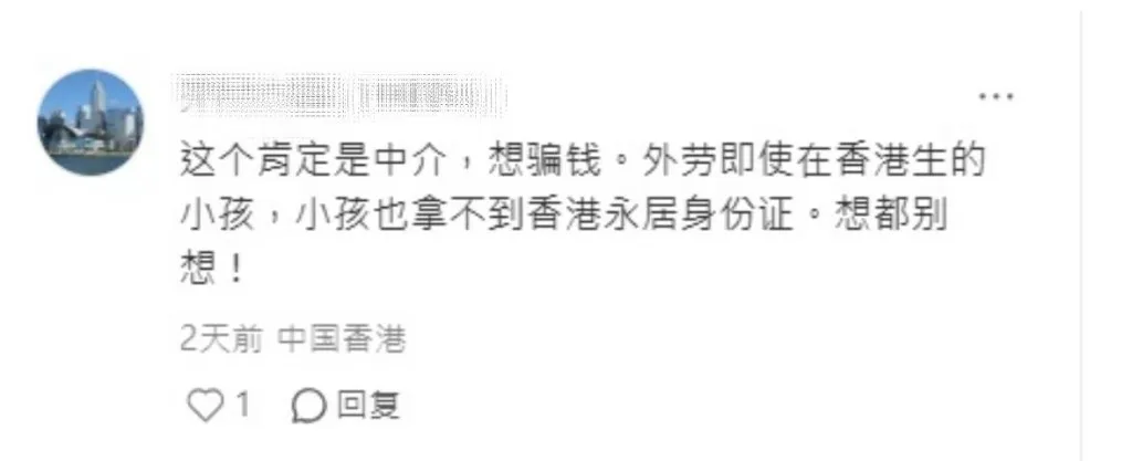 ▲撰文者指,內地外勞與菲傭及印傭不同,聲稱只要是中國居民,且在港有“合法逗留”身份,所生子女亦是“100%永居”。