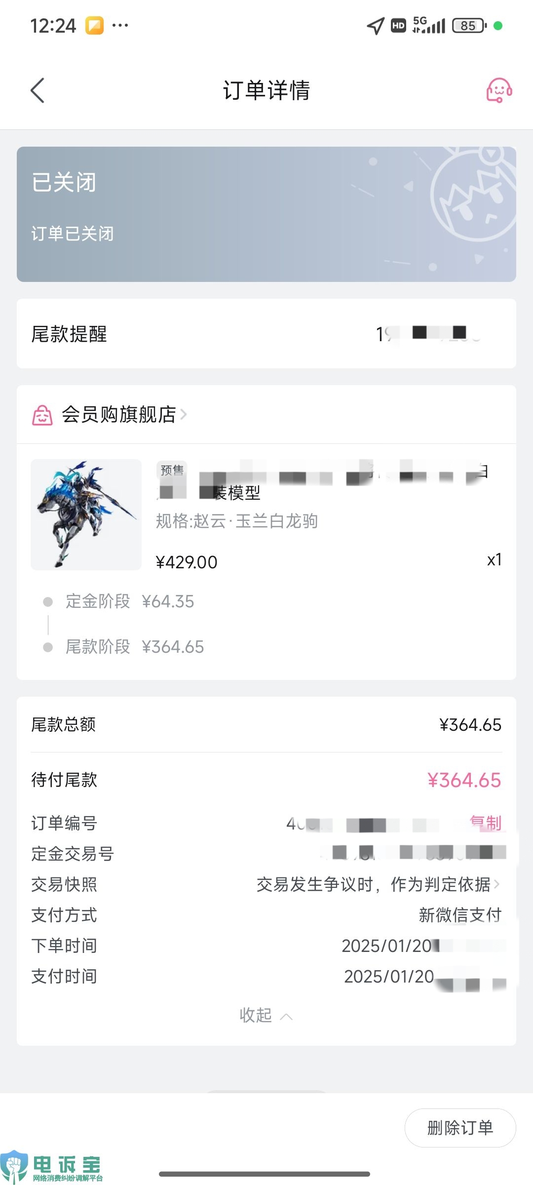 6月30日,上海市的任先生向電訴寶投訴稱其於2025年1月20日在嗶哩嗶哩會員購平台預付購買某拼裝模型,但始終未收到補尾款通知。經多次與平台交涉,**平台堅稱已發送短信通知卻拒絕提供發送證明,**並以逾期為由拒絕補款。用户因未接收到通知導致錯過補款時效,對平台拒不提供通知憑證且消極處理的態度表示強烈不滿,目前已等待近半年,直至近日自行查看才發現問題。