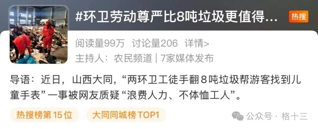 昨天一連幾條熱搜,説一廣東遊客在山西大同旅遊期間,孩子把電話手錶遺落在高鐵垃圾袋中。第二天,這個遊客撥打了3小時12345熱線,還在網上發幾條帖子引發輿論,一副要網曝大同文旅的架勢,要求幫忙尋找電話手錶。
