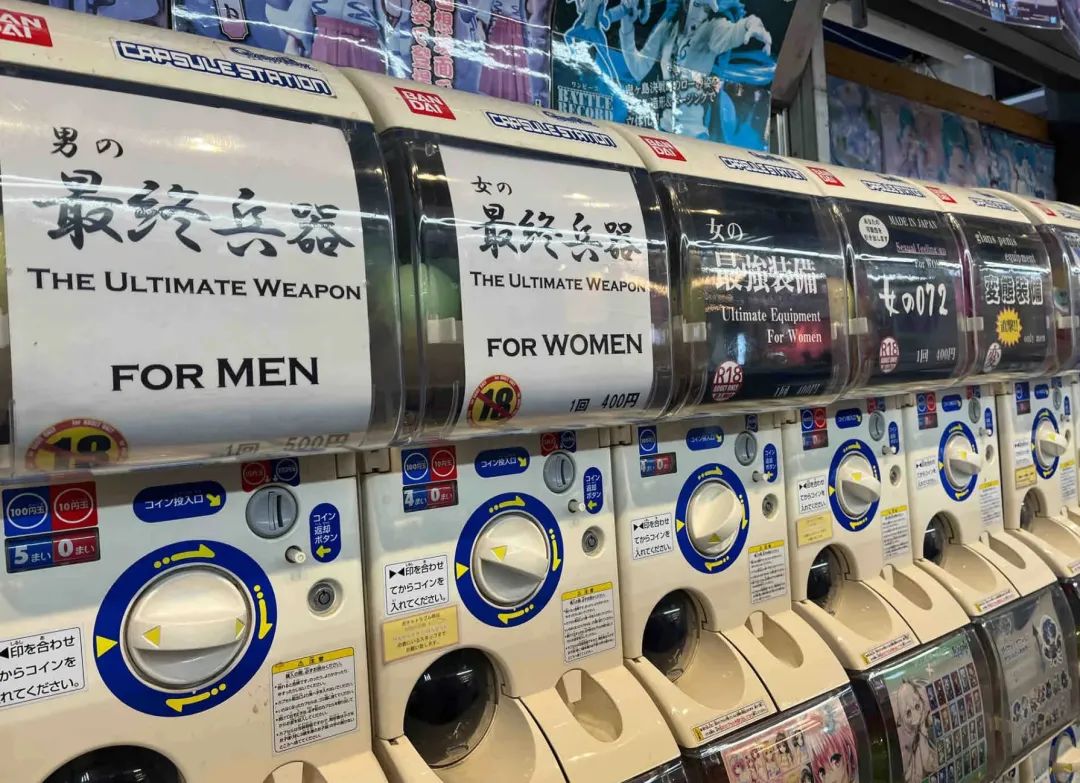 扭蛋店內,你能輕鬆找到帶有**“男の兵器”、“女の裝備”、“最終兵器”**等逆天字眼的扭蛋機,裏面的東西自然是鐵打的“成人用品”,從避孕套到情趣內衣,沒有你想不到,沒有它放不進去的。