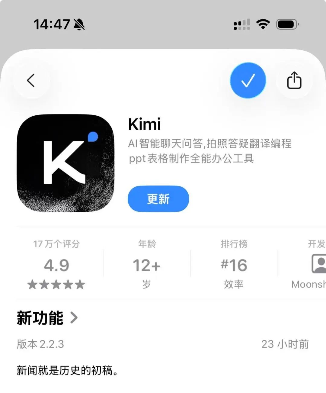 所以説有些時候,本事這玩意是很難藏着掖着的,你要真靠譜,想躲着不出名都難。比如新版Kimi app更新詳情上,就很低調的只寫了一句,新聞就是歷史的初稿。
