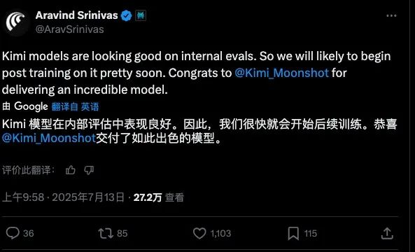 就連估值 150 億美元的知名AI 搜索公司 Perplexity ,他家CEO,前 OpenAI 研究科學家 Aravind Srinivas,都在推上公開圈了月之暗面,希望他們Perplexity以後能基於 Kimi K2 進行訓練。