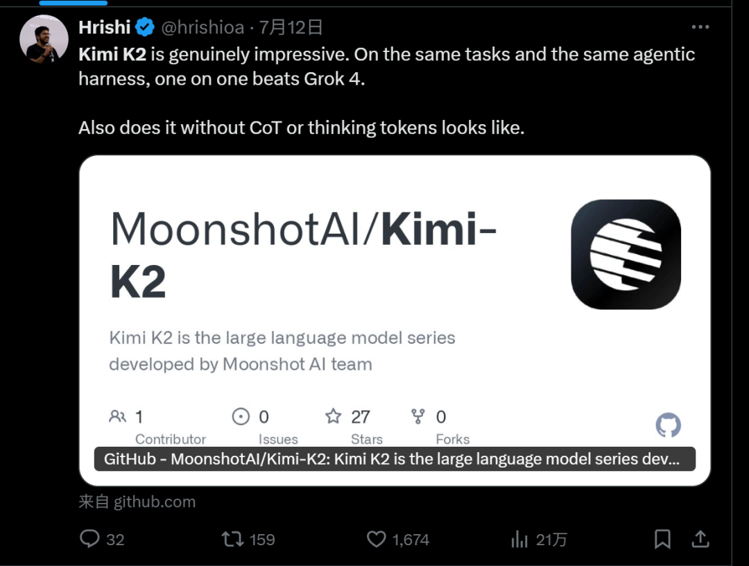 還有一家市值十億美元,做AI應用的公司Greywing,創辦人Hrishi Olickel 把它跟同樣前幾天發佈的Grok4對比了一下,發現Kimi K2直接給Grok4幹碎了。