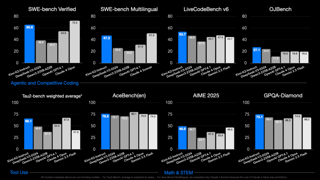 Kimi K2在代碼、工具調用、數學、通用知識等性能測試中,表現都相當不錯,一些項目甚至領先於頂尖的閉源模型。
