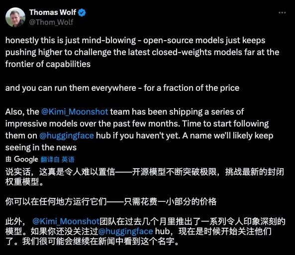 更牛逼的是,我還看到Hugging face 聯合創始人Thomas Wolf,也對Kimi K2大加讚賞,説這簡直難以置信,還向外國網友們安利了一波月之暗麪糰隊。