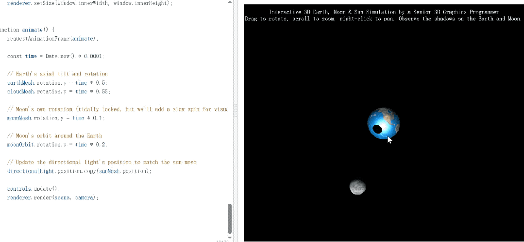 首先看Kimi,我感覺它這個光線做的就非常舒服,沒有特別亮的地方,暗部也不全黑,能看見城市燈光。而且這個地球上的雲層,不是貼上去的,這玩意可以即時移動位置,真的是在飄的!