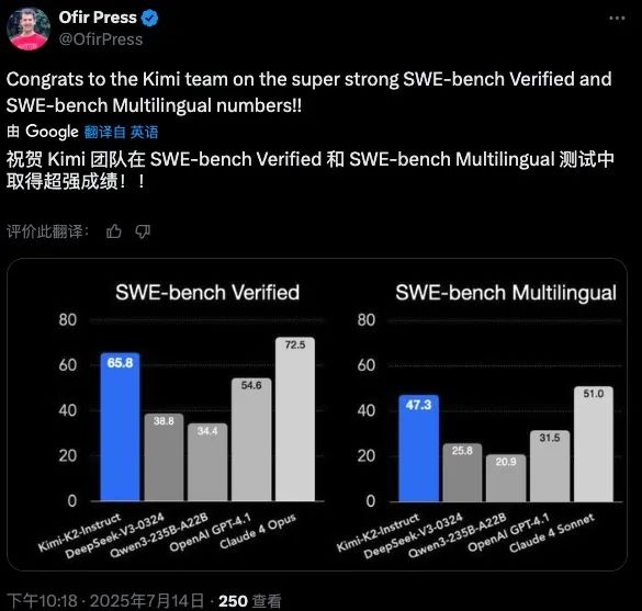 SWE-bench 榜單的作者Ofir Press,看到這成績以後還專門發文點讚了Kimi團隊。