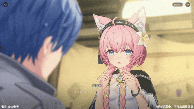 而這種表現力,同樣延續到了動畫演出中。比如在主線劇情玩家昏倒被救的片段中,初次遇上粉發少女璐璐卡,她會遞上一瓶自己調製的、成分不明的“小藥水”,把玩家當成“小白鼠”。而當玩家嚐出味道有些奇怪時,她就會眼神閃躲,時而點頭又慌張地搖頭,雙手不斷擺弄,把那種帶點“粉切黑”氣質的性格表現得淋漓盡致。