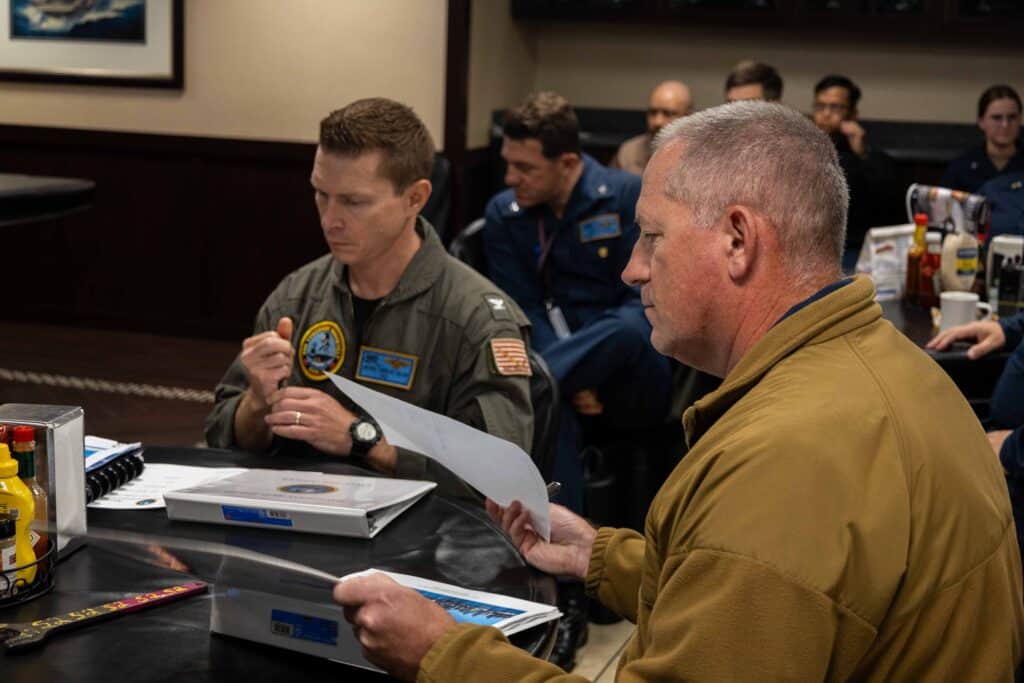 2025年7月13日,美國海軍“西奧多·羅斯福”號航空母艦(CVN 71)艦長布萊恩·施魯姆上校聽取航行簡報。“西奧多·羅斯福”號是“西奧多·羅斯福”號航母打擊羣旗艦,目前停靠在聖地亞哥母港的北島海軍航空站碼頭,進行計劃增量維修期間的例行維護和設備升級。(美國海軍照片,由二級大眾傳播專家賈丁·比弗斯拍攝)