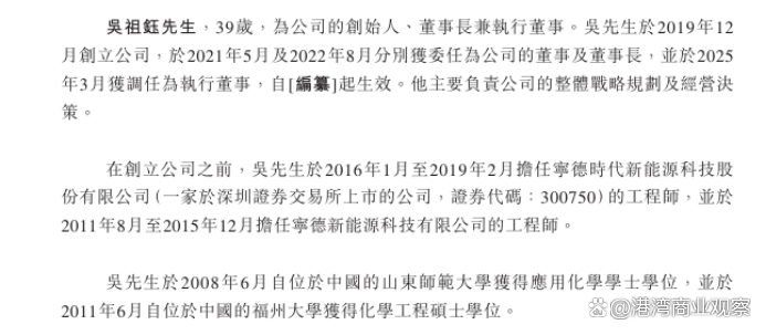 公開資料顯示,吳祖鈺於2011年6月從福州大學化工專業碩士畢業後,當年8月加入寧德新能源科技有限公司擔任工程師。