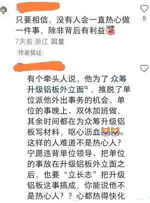 針對不想出錢的“釘子户”,贊成派除了私聊、找熟人勸説,激進一點的甚至威脅,如果外立面升級鋁板不成,交房後他們就帶頭甩賣。