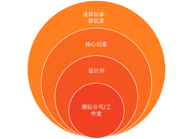 潮玩工作室和公司是IP發起者,而核心玩家則是新產品最重要的傳播者,連接着最外層規模龐大的淺層玩家和新玩家。