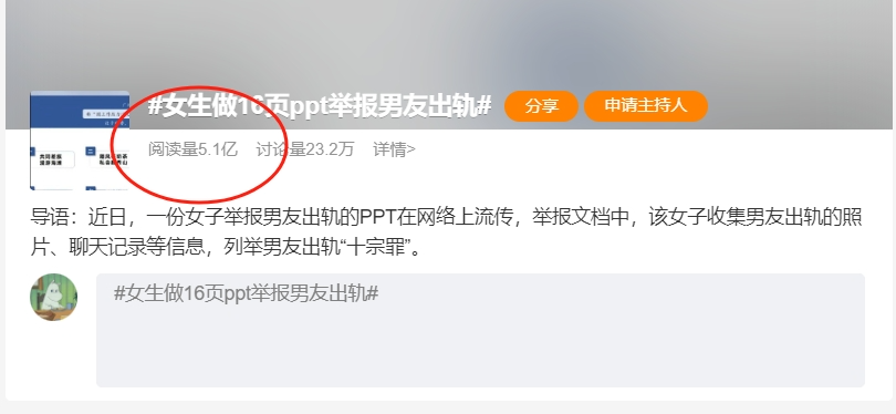 作為對比,2022年,女生16頁PPT舉報男友出軌的話題,砍下了5億閲讀量。