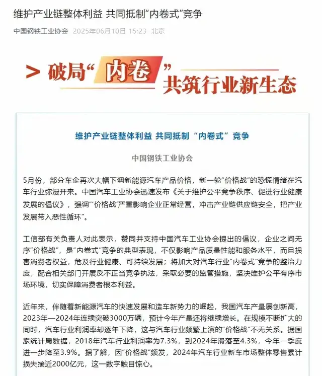 此前的5月31日,中國汽車工業協會發布《關於維護公平競爭秩序,促進行業健康發展的倡議》。隨後,工信部表態,贊同並支持中國汽車工業協會提出的倡議,將加大汽車行業“內卷式”競爭整治力度。