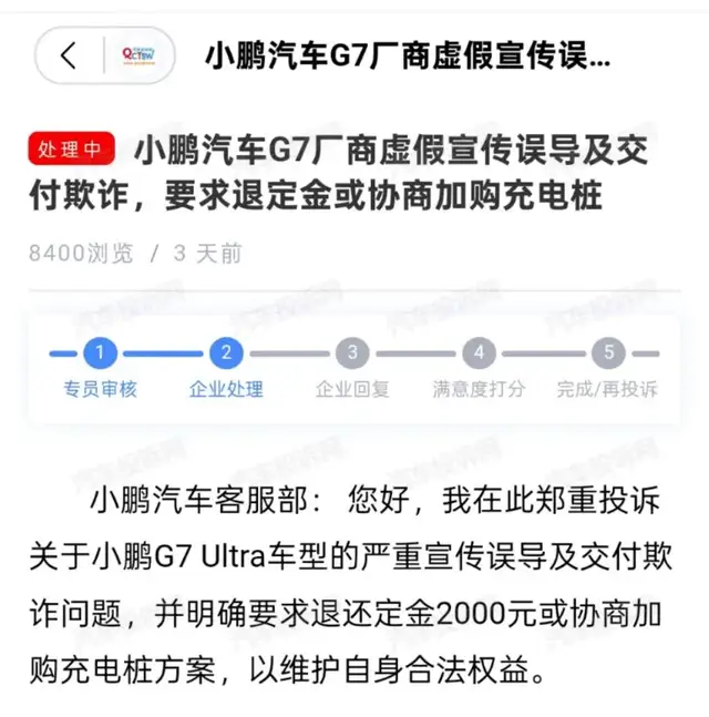 7月11日,夏先生在汽車投訴網發起投訴稱,在7月3日小鵬G7發佈會後支付2000元定金鎖單G7 Ultra版,原因是CEO何小鵬多次強調該車型“全球首發搭載3顆圖靈AI芯片”,具備“行業最強智駕功能”。