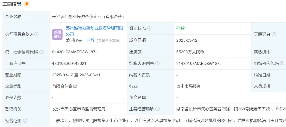 具體來看,長沙泉仲創業投資合夥企業(有限合夥)成立於2025年3月,執行事務合夥人為蘇州維特力新創業投資管理有限公司,經營範圍包括創業投資、以自有資金從事投資活動。