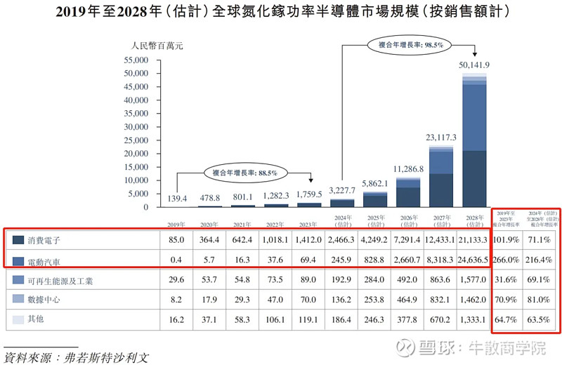 上游,根據弗若斯特沙利文的數據,2023年,氮化鎵功率半導體的市場規模為人民幣18億元,佔全球功率半導體市場的0.5%,伴隨着技術的愈發成熟以及下游應用範圍更加廣泛,2023年被視為氮化鎵行業錄得指數級增長的開局之年。