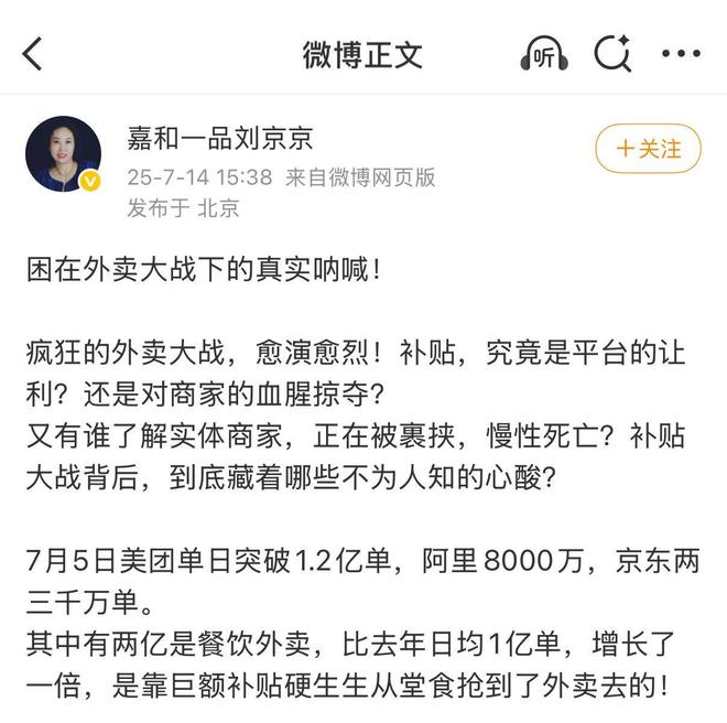 7月14日,北京嘉和一品企業管理有限公司總經理劉京京在網絡社交平台發出“困在外賣大戰下的真實吶喊!”劉京京表示,“7月5日美團單日突破1.2億單,阿里8000萬,京東兩三千萬單。其中有兩億是餐飲外賣,比去年日均1億單,增長了一倍,是靠鉅額補貼硬生生從堂食搶到了外賣去的!”