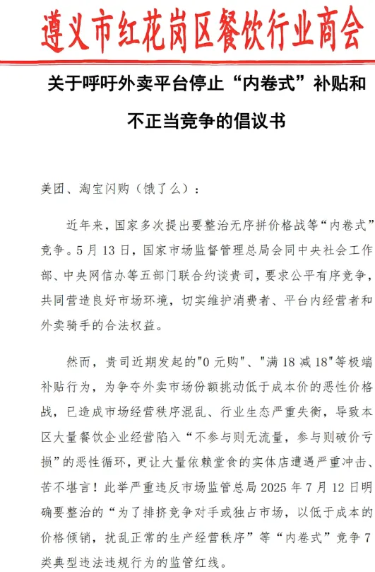 7月15日,貴州省遵義市紅花崗區餐飲行業商會發布《關於呼籲外賣平台停止“內卷式”補貼和不正當競爭的倡議書》。