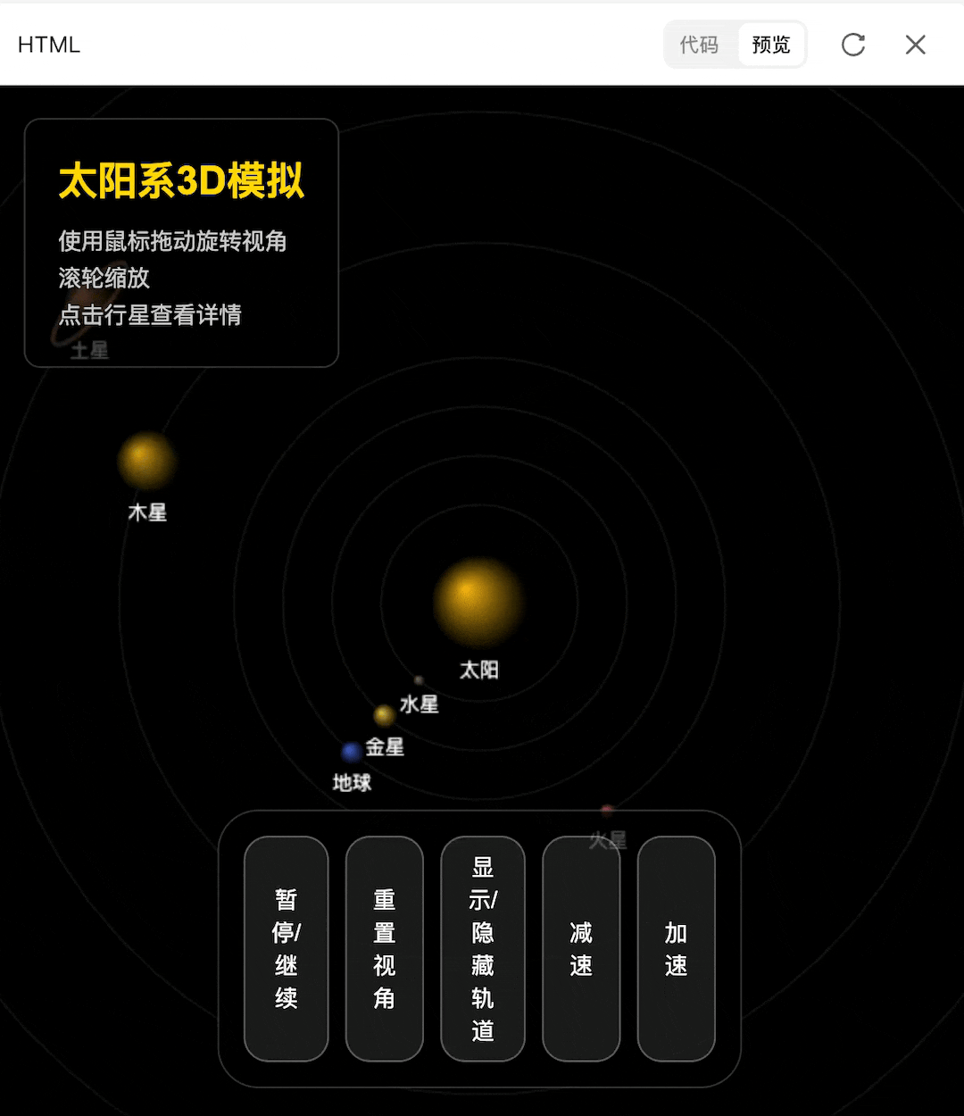 比如讓 K2 用 HTML 構建一個網站,展示太陽系的 3D 模擬。K2 不是深度思考模型,直接一句廢話沒説就開始寫代碼。
