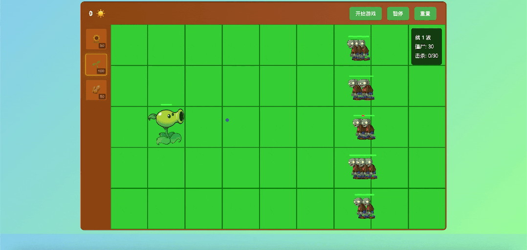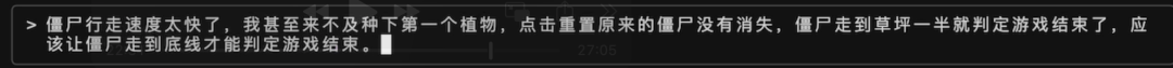 修復後能看到殭屍了,結果發現殭屍速度真的飛快,並且重置遊戲後植物能消失,但殭屍不會消失。遊戲結束判定邏輯也有問題。