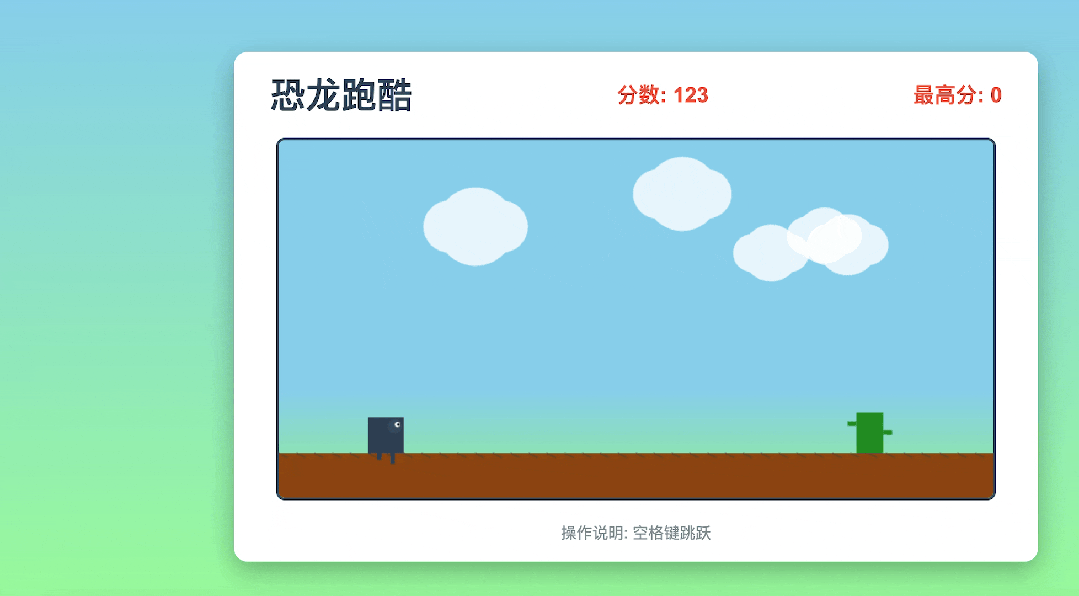 來看看成果如何。雖然恐龍像個偷跑的垃圾桶,但飛鳥、仙人掌以及背景的視覺還是設計的不錯的,而且恐龍得分的基本邏輯、環境陷阱的基本邏輯、遊戲結束的邏輯,都是沒有問題的。