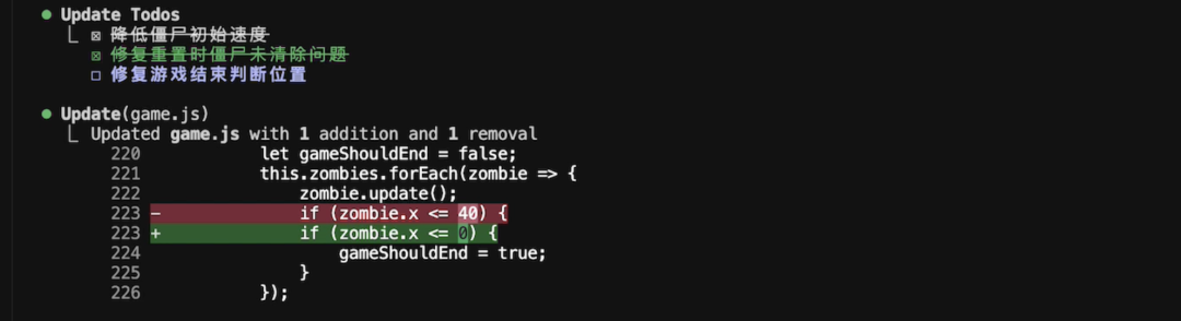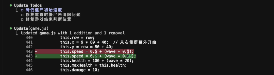 最後我索性簡化了 “ 第X波 ” 的邏輯,改成了 “ 就1波 ”,遊戲開始後就直接出現 30 個殭屍,全部擊殺完就勝利。這期間也順便讓 K2 修復了殭屍位置沒有跟網格對齊的問題,堅果牆不能阻擋殭屍前進的問題,殭屍攻擊的距離判定問題,豌豆射手的豌豆顏色問題等等。