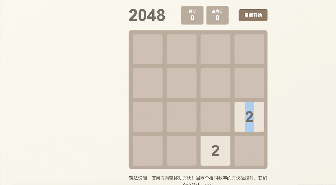 來看看成果如何。最重要的方塊移動後的數字合併邏輯實現了,連配色都和經典版本幾乎是一樣的,也提供了最高分展示來激勵玩家,並能隨時重置。