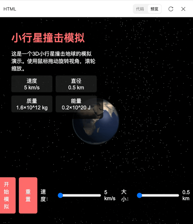 接下來,知危還讓 K2 幫忙模擬小行星撞擊地球、製作數據儀表盤組件,雖然有些小 Bug,但也一次成功了。