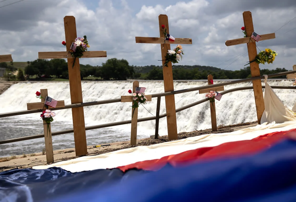 7月12日,悼念洪災遇難者的十字架豎立在美國得克薩斯州瓜達盧普河岸邊。新華社發(尼克·瓦格納攝)