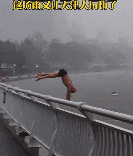 天津標配跳水大爺的生活也完全不受暴雨影響。暴雨天氣裏,年輕人在橋下躲雨刷手機,大爺們卻在享受"水上樂園"的VIP待遇。