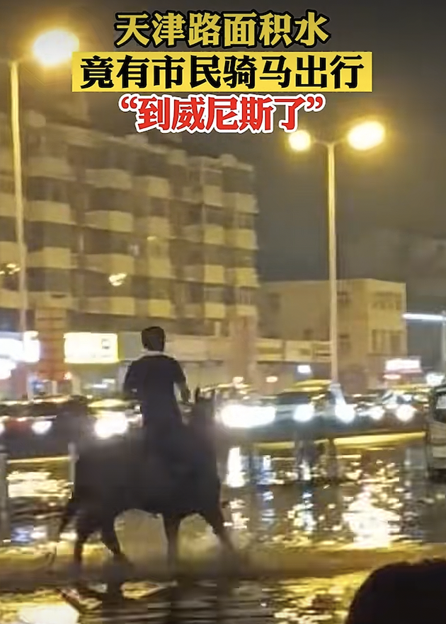 還有人在雨中騎馬出行,主打就是一個有什麼交通工具用什麼交通工具。