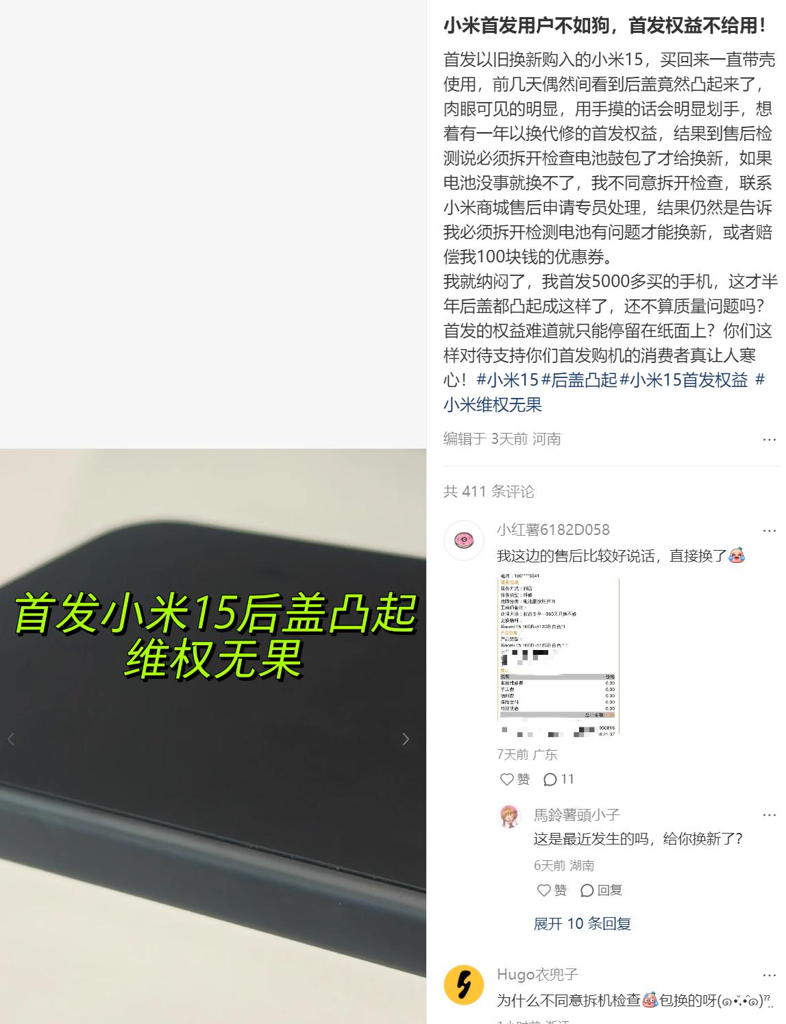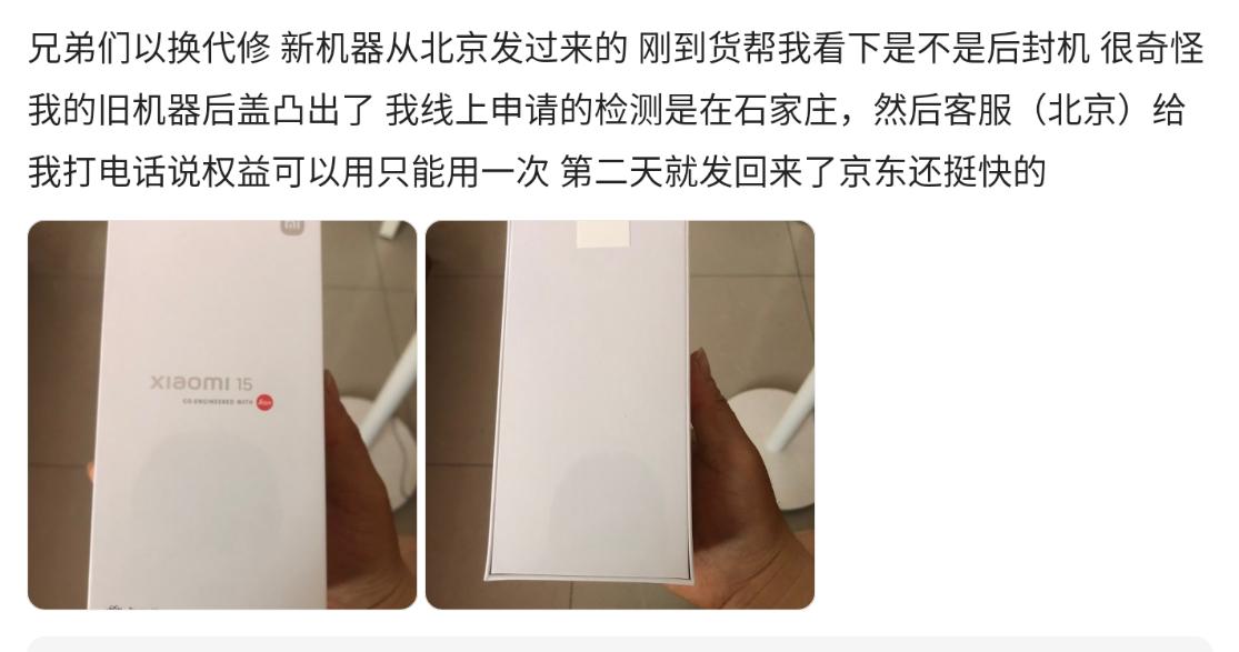 還有網友質疑小米15的首發權益,其表示,首發以舊換新購入的小米15,買回來一直帶殼使用,前幾天偶然間看到後蓋竟然凸起來了,肉眼可見的明顯,用手摸的話會明顯劃手,想着有一年以換代修的首發權益,結果到售後檢測説必須拆開檢查電池鼓包了才給換新,如果電池沒事就換不了。