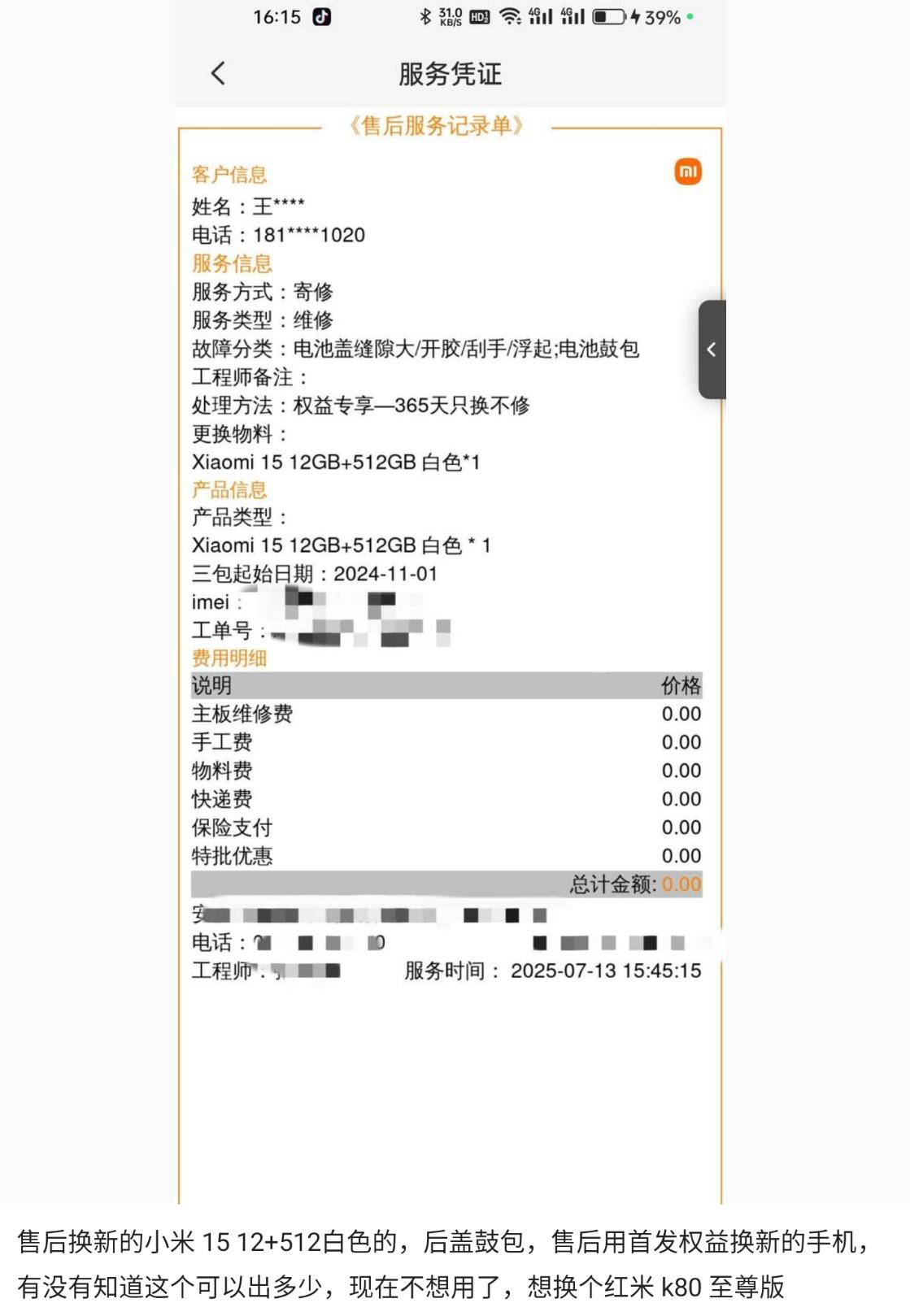還有換新的用户曬出了售後服務記錄單,可以看到故障分類是電池蓋縫隙、開膠、刮手、浮起;電池鼓包。