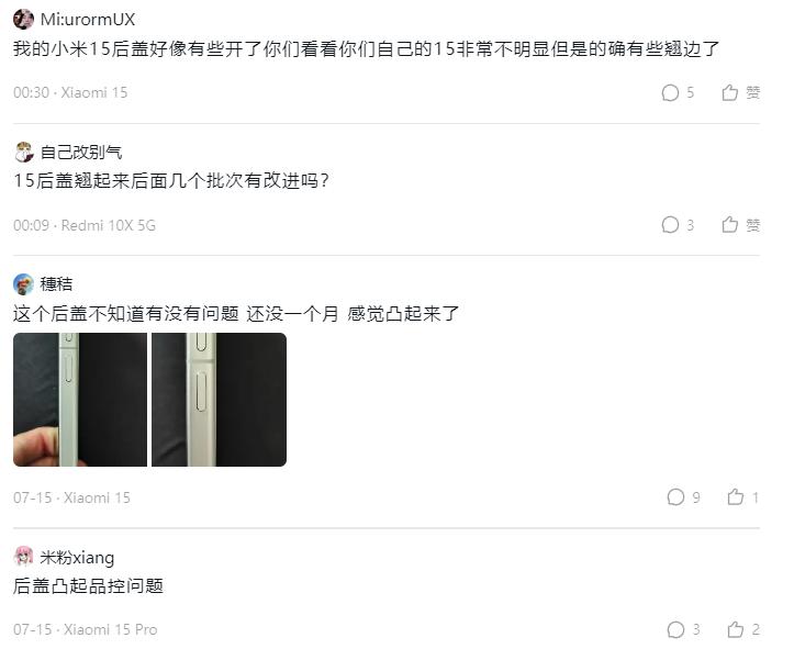 目前在小米社區及社交媒體上,有不少機主在反饋小米15的後蓋翹起問題。