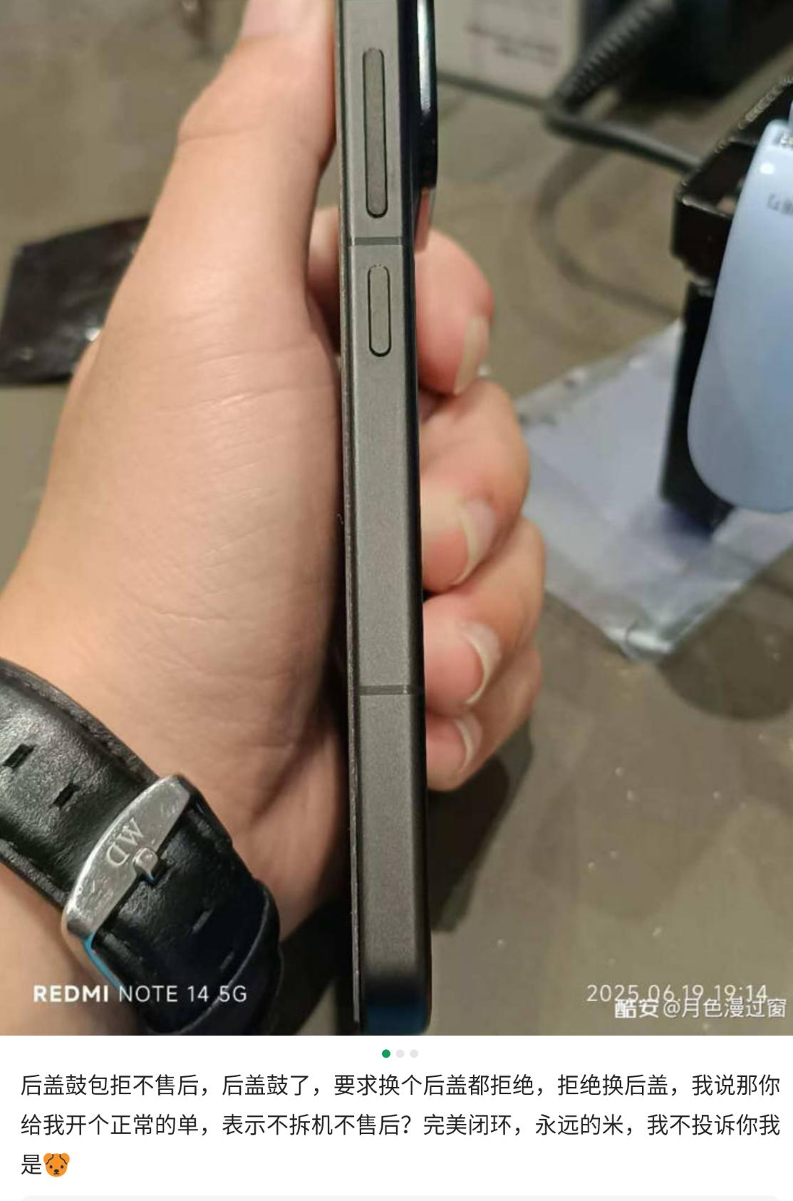 到了5月,更糟的來了:後蓋開始微微鼓包,起初以為是錯覺,結果6月鼓得越來越明顯,肉眼可見的凸起,拿在手裏都硌手。7月放假第一時間衝線下售後,工程師掃了一眼就輕描淡寫:“可能脱膠,補點膠就行。” 我直接懵了:“這都鼓成這樣了,首發自帶的以換代修不能用嗎?“他才支支吾吾説要拆機檢測,看是電池問題還是脱膠——拜託,鼓成這樣還需要拆?我怕拆了反被賴賬,當場拒絕。