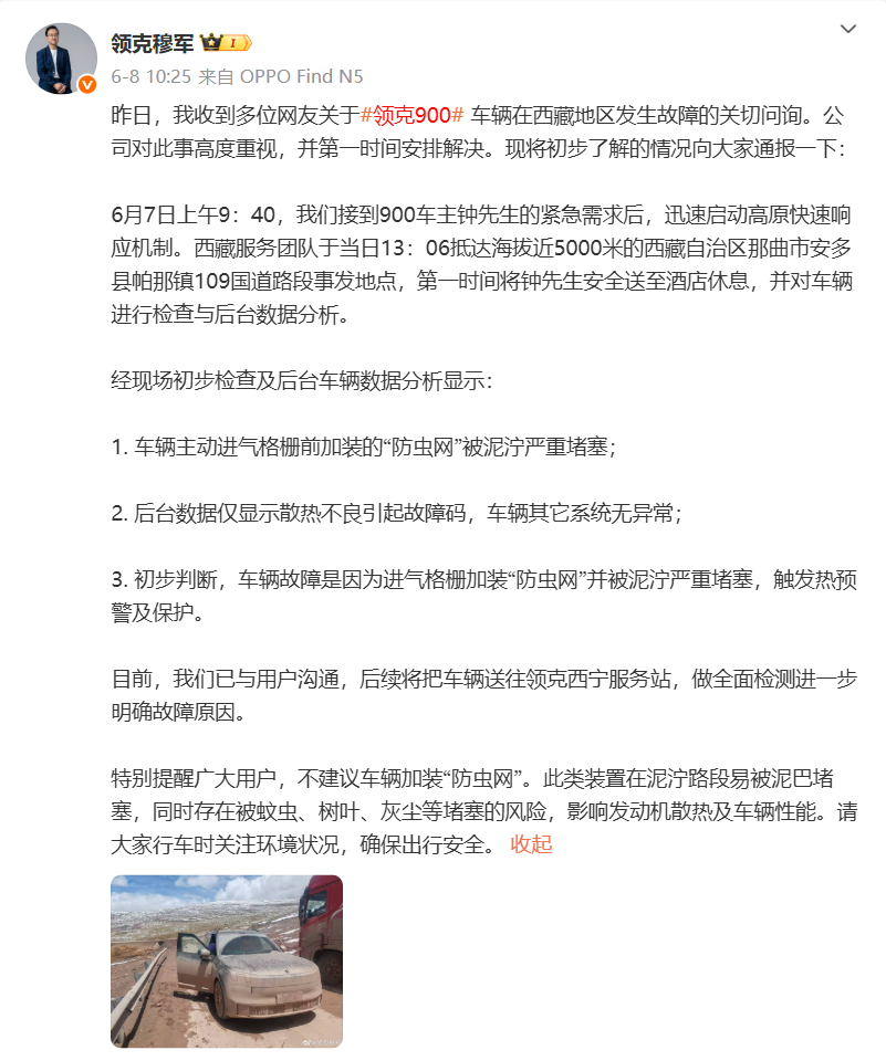 為啥脖子哥會問這個問題,因為在 6 月 8 號,有輛領克 900 在西藏趴窩了,可以看到這車頭全是泥,這個進氣格柵是被完全堵住了。