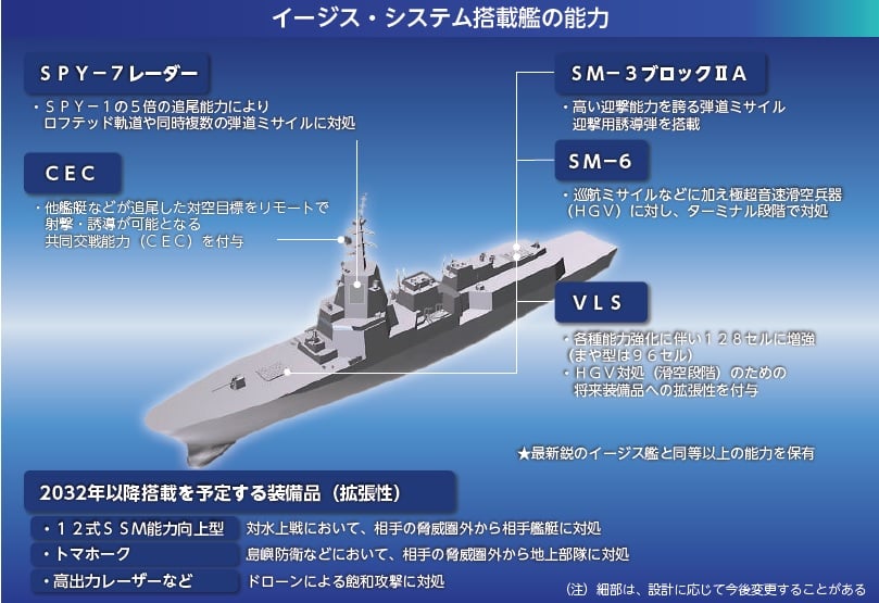 報告還包含一張圖表,展示了正在建造的“宙斯盾系統搭載艦”(ASEV)的能力。這兩艘ASEV驅逐艦計劃於2027年和2028年完工。圖表顯示,改進型12式反艦導彈、“戰斧”巡航導彈以及用於應對無人機飽和攻擊的能量武器,計劃於2032年後安裝。