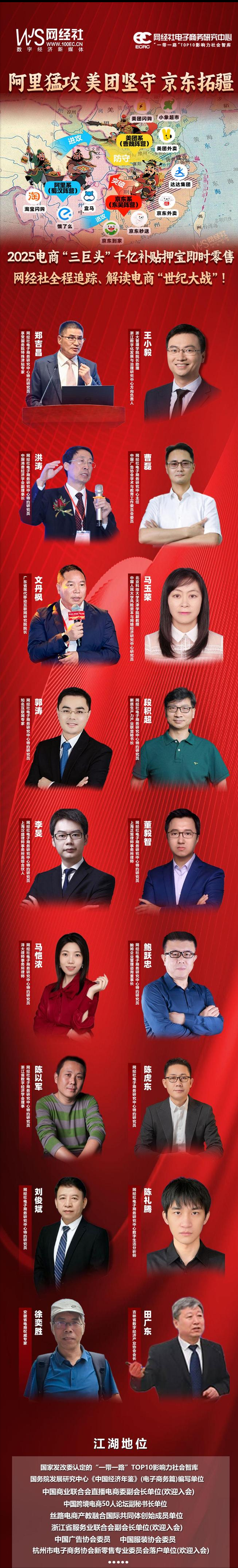 對此,網經社發起“阿里猛攻、美團堅守、京東拓疆,2025電商‘三巨頭’幹億補貼押寶即時零售”大型主題策劃,發佈**《2025年電商“三巨頭”押寶即時零售全景分析報告》**,組織了18業內專家、投資人、律師、高校教授、分析師,全方位解讀此次電商“世紀大戰”!