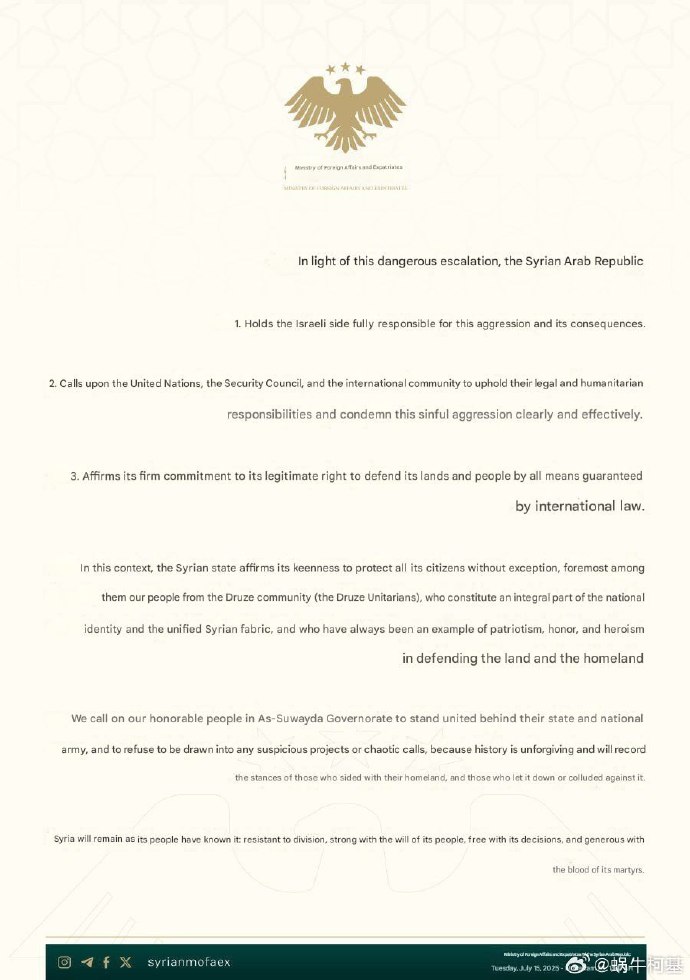 敍利亞所謂外交部強烈譴責以色列襲擊其南部,警告以色列陰謀破壞敍利亞的和平與穩定。