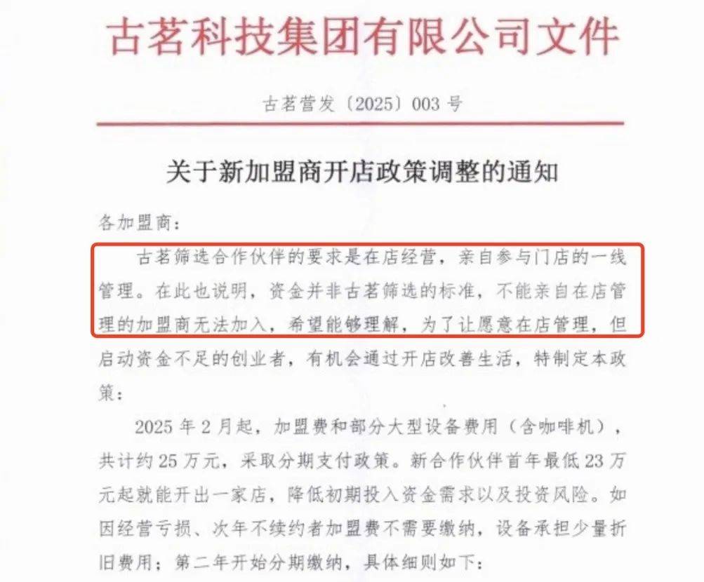 新政策下,古茗下調了加盟門檻5萬元,首年最低投資額23萬元起,條件是必須親自進店、深度參與日常經營。品牌多次強調,資金並非考察標準,無法保證在店管理的加盟者,將不被接受。