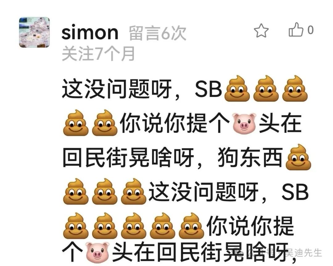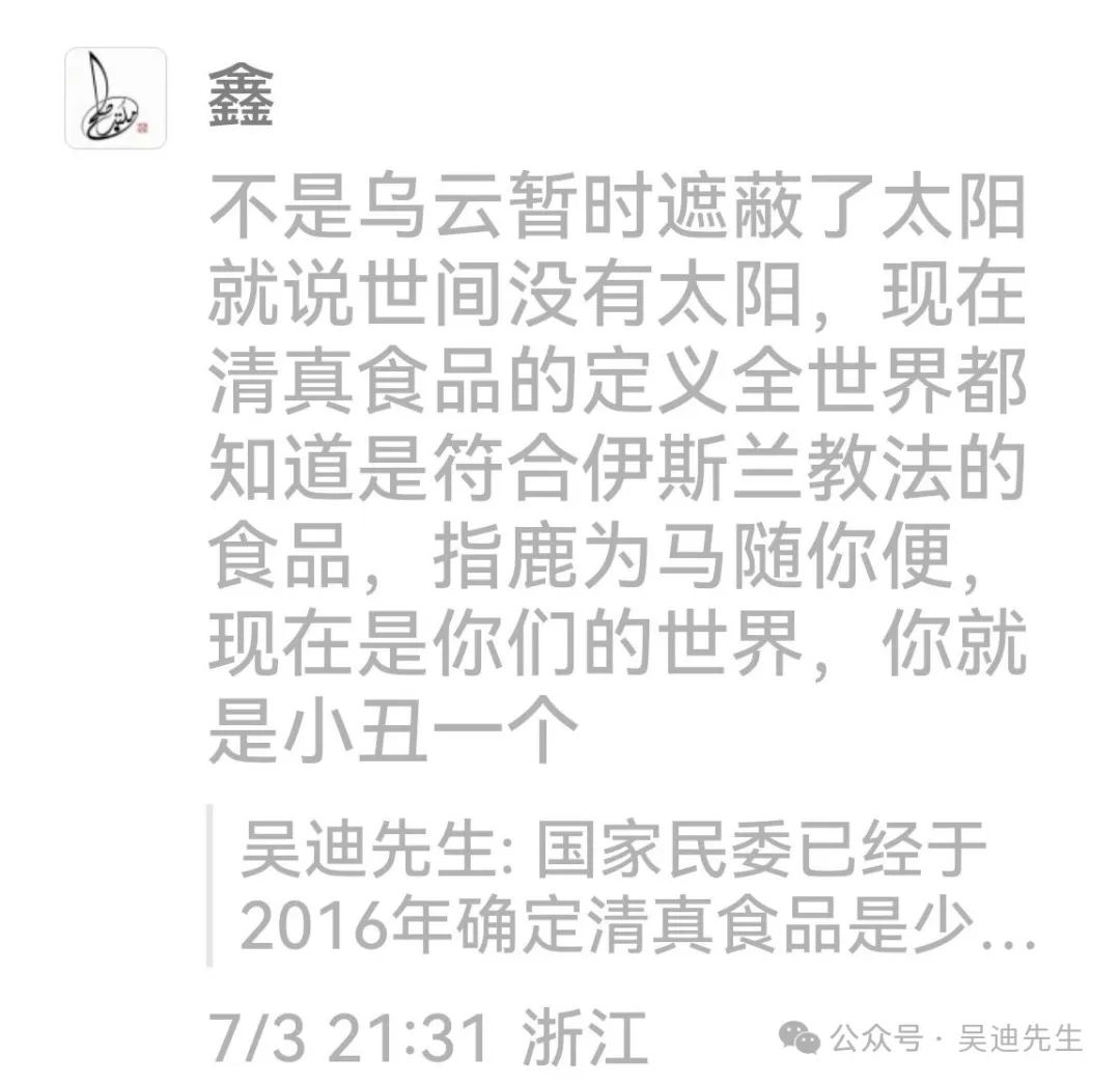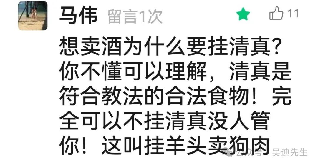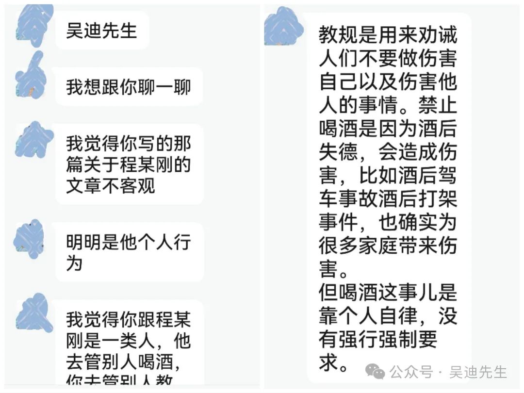 西燕:吳迪先生,我想跟你聊一聊。我覺得你寫的那篇關於程某剛的文章不客觀。我覺得你跟程某剛是一類人,他去管別人喝酒,你去管別人教規。挑起民族社會事端。都做不到尊重別人是別人尊重自己是自己。明明是他個人行為。你看評論, 搞的現在有些人因為私人恩怨,去説一個民族怎麼怎麼不好。也許一個民族裏因為個把人確實有問題,但是也不能一杆子打翻一船人啊?太冤枉了別的好人了啊?我是一個愛國、愛黨 、愛教的人, 我也不喝酒不抽煙也不打麻將。教規是用來勸誡人們不要做傷害自己以及傷害他人的事情。禁止喝酒是因為酒後失德,會造成傷害,比如酒後駕車事故酒後打架事件,也確實為很多家庭帶來傷害。但喝酒這事兒是靠個人自律,沒有強行強制要求。程某剛 ,那樣做就是不對,損壞別人財產利益。干涉別人人權自由。確實不對 ,教規上還有禁止吸毒這事兒,你能説教規也不對?
