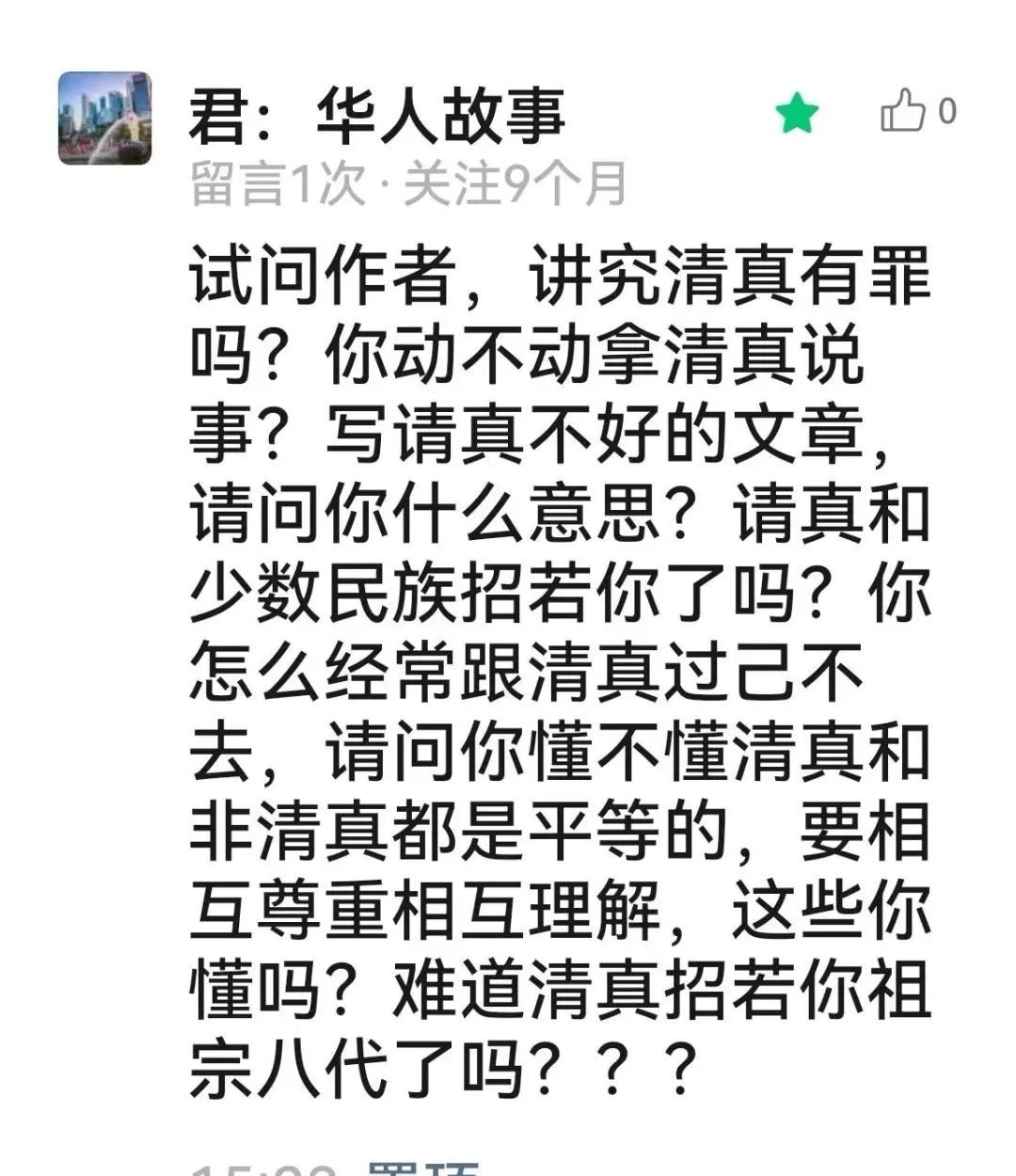 因為前面寫了山西長治程某剛用教法禁酒的文章,回族女孩西燕(化名)私信我,因為她的觀點是和評論區一些人的觀點大體相同,所以我想用公開信的方式來回復她,也一併回覆那些評論區説我破壞民族團結,挑起民族矛盾的人吧。私信內容全文如下: