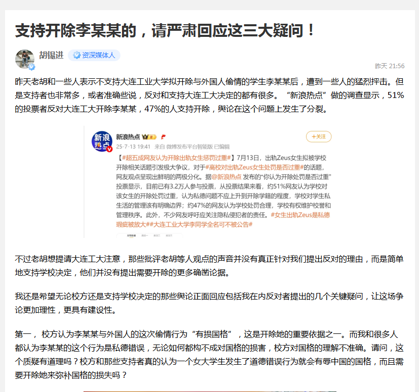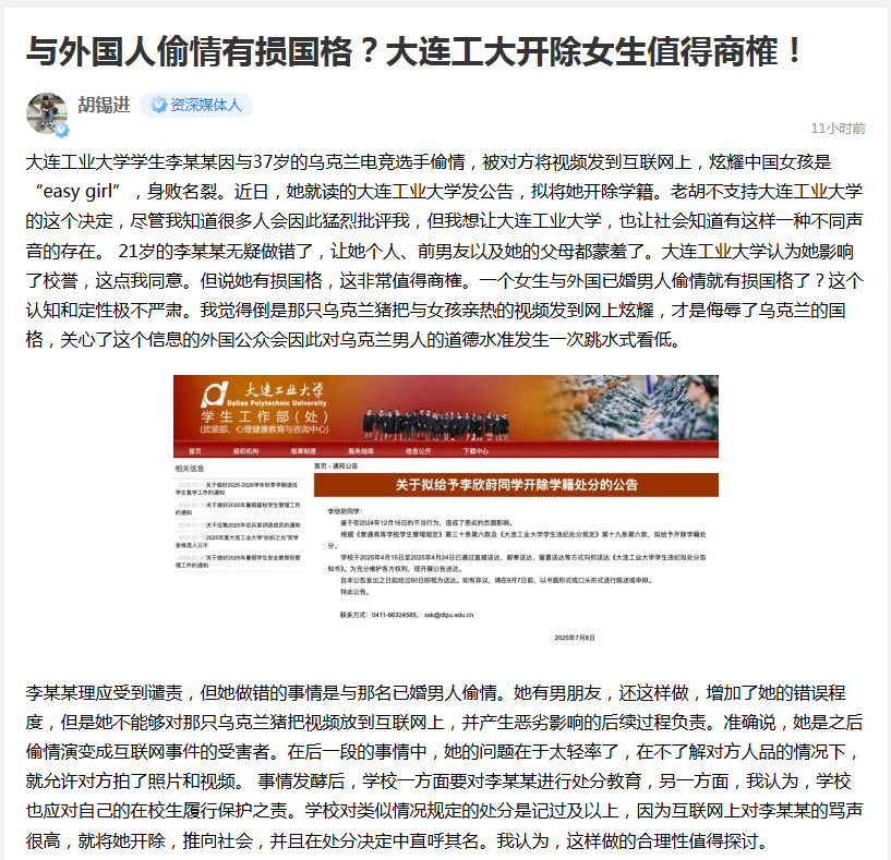 近日,環球時報前總編因對大連工業大學針對一名違紀女生的處罰不滿,全然將組織觀念拋諸腦後,跳過正常申訴渠道,直接藉助自媒體連續發聲向學校施壓,企圖以輿論力量干預高校自主管理。他的行為不僅將 “以媒體施壓替代制度化申訴”“媒體人退休後話語權行使邊界” 等爭議話題推到公眾面前,更引發了人們對這位前總編退休後濫用公共話語權的警醒與反思。