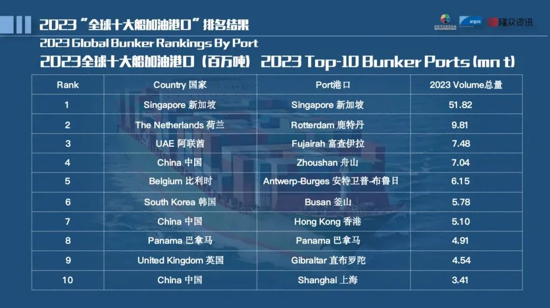 這筆業務不可小覷,全球國際船舶航行燃油需求量每年約為2億噸,僅亞太地區保税燃油消費量就超過9000萬噸。2023年,全球第一大燃油加註港新加坡港加註了5182萬噸船用燃油,是中國所有港口總和的2.63倍,同期中國共計完成保税船供油量1969萬噸。當年全球十大燃油加註港中,中國港口占三席,分別是舟山港、香港港和上海港,各自完成了704萬噸、578萬噸、341萬噸。