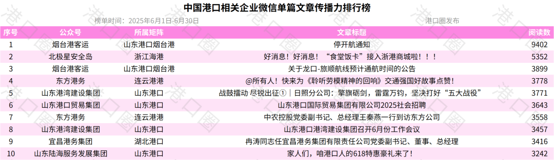 6月微信單篇文章傳播力排行榜中出現多個新面孔,有福建港口集團的《福建港口集團2025年中青年幹部培訓班開班》、河北港口集團的《河北省港口協會揭牌成立》和海南港航的《海南港航控股有限公司2025年社會招聘》,涵蓋人才培養、業務動態以及招聘等多方面內容。