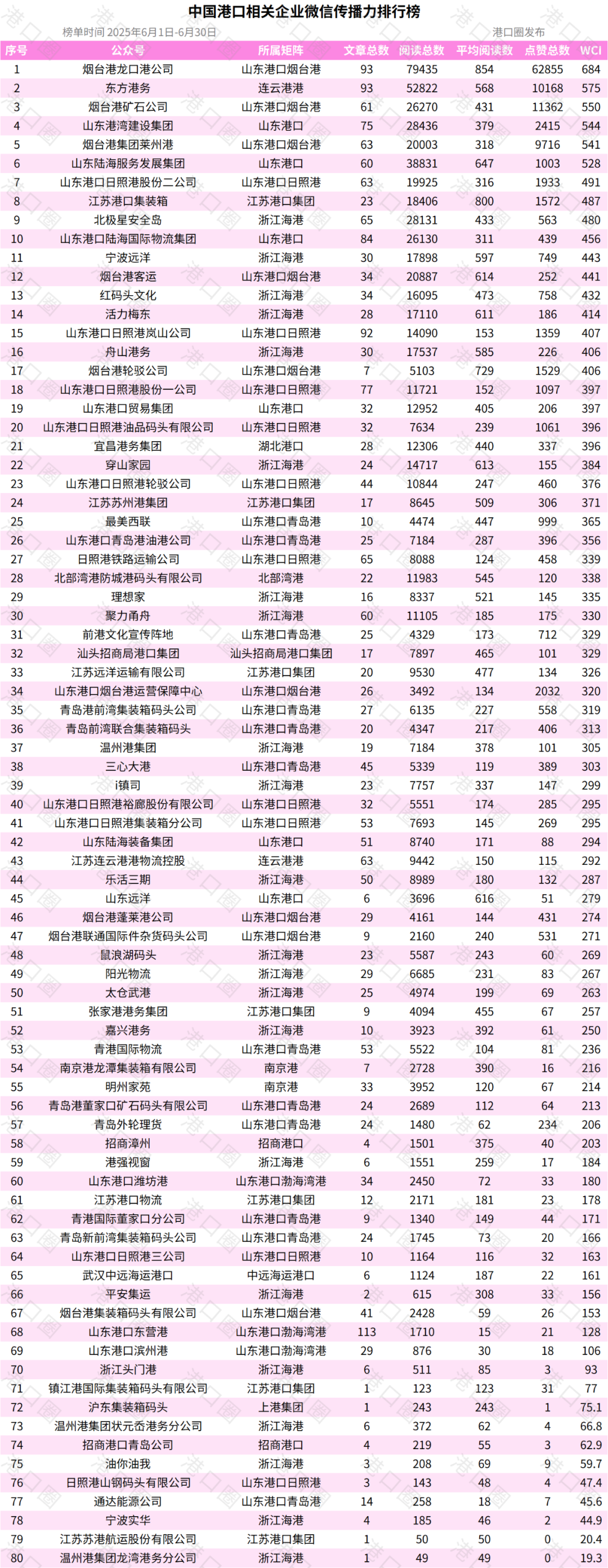 6月,中國港口相關企業微信傳播力排行榜前十為:煙台港龍口港公司(第1)、東方港務(第2)、煙台港礦石公司(第3)、山東港灣建設集團(第4)、煙台港集團萊州港(第5)、山東陸海服務發展集團(第6)、山東港口日照港股份二公司(第7)、江蘇港口集裝箱(第8)、北極星安全島(第9)、山東港口陸海國際物流集團(第10)。
