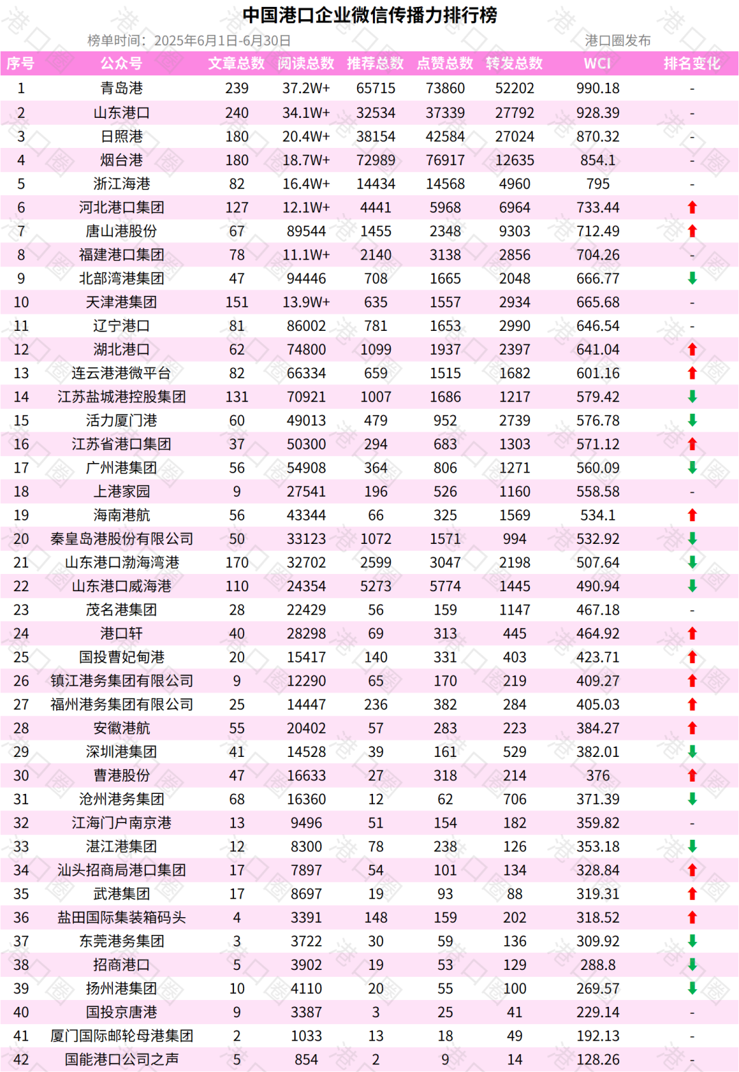 2025年6月,中國港口企業微信傳播力排行榜前十名為:青島港(第1)、山東港口(第2)、日照港(第3)、煙台港(第4)、浙江海港(第5)、河北港口集團(第6)、唐山港股份(第7)、福建港口集團(第8)、北部灣港集團(第9)、天津港集團(第10)。