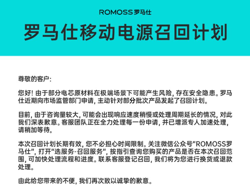 因產品存在安全隱患,2025年6月16日,羅馬仕發佈公告稱,召回2023年6月5日-2024年7月31日生產的三款充電寶,共計49.17萬台。