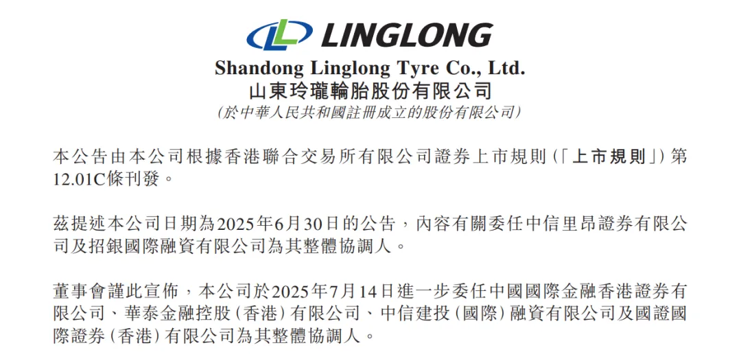 7月14日,港交所文件顯示,山東玲瓏輪胎股份有限公司進一步委任中國國際金融香港證券有限公司、華泰金融控股(香港)有限公司、中信建投(國際)融資有限公司及國證國際證券(香港)有限公司為整體協調人。此前,玲瓏輪胎已向港交所主板遞交上市申請,中信證券、招銀國際為聯席保薦人。截至7月15日收盤,玲瓏輪胎(601966.SH)報14.88元/股,市值217.77億元。